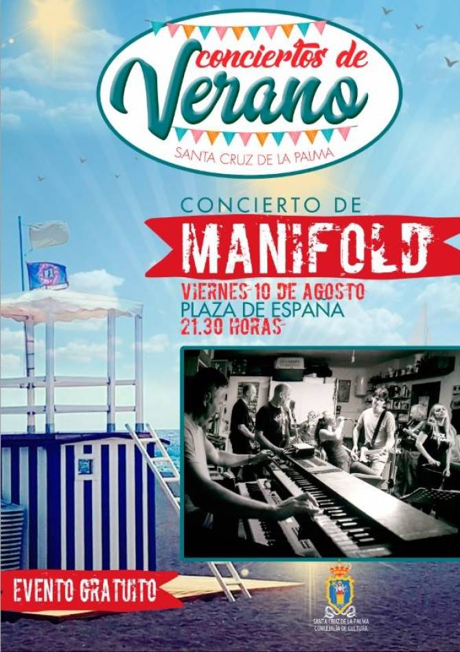 El programa de conciertos de verano al aire libre organizado por el Ayuntamiento de Santa Cruz de La Palma, a través de la concejalía de Cultura, acoge este viernes la actuación del grupo de rock & roll Manifold, un conjunto formado por tres ingenieros que llegaron a La Palma para trabajar en el Observatorio del Roque de Los Muchachos y que lleva 20 años haciendo bailar a los palmeros. El concierto tendrá lugar en la plaza de España a partir de las 21:30 horas, con entrada libre.
