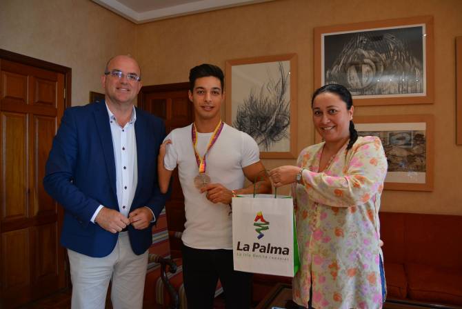El presidente del Cabildo de La Palma, Anselmo Pestana, y la consejera de Emergencias y Participación Ciudadana, Carmen Brito, han recibido hoy en el palacio insular al deportista palmero Carlos Pérez, tras su exitosa participación en el Campeonato de Europa de Atletismo Adaptado de Berlín, en el que se alzó con la medalla de bronce en el salto de longitud, con una marca de 6,22 metros.