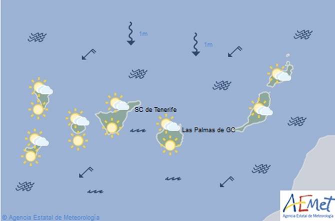 Viento del nordeste, con intervalos de fuerte en las vertientes noroeste y sudeste por la tarde. Brisas en costas oeste y suroeste.