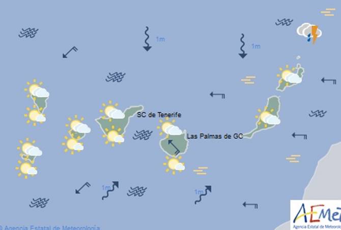 Viento de componente este, algo más intenso en los extremos sur y noroeste, con brisas en costas. En medianías y zonas altas, del sudeste flojo a moderado disminuyendo a lo largo del día.