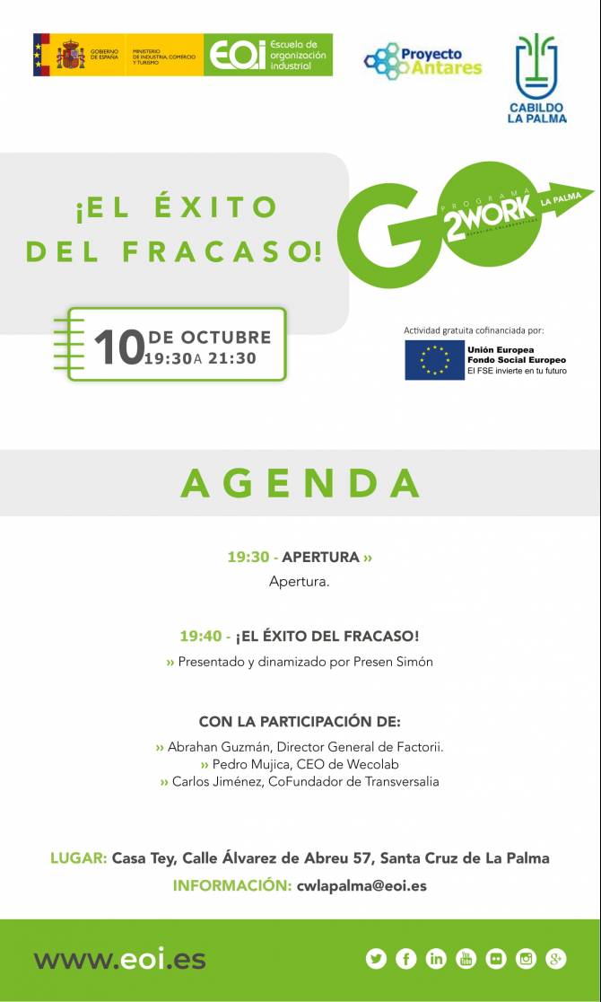 La importancia de asumir los fracasos como parte del aprendizaje en cualquier proyecto empresarial centrará la jornada que organiza la Escuela de Organización Industrial (EOI) en el Espacio Coworking EOI de Santa Cruz de La Palma. Tendrá lugar el próximo día 10 de octubre en Casa Tey, a partir de las 19:30 horas, y está abierta a cualquier persona interesada.