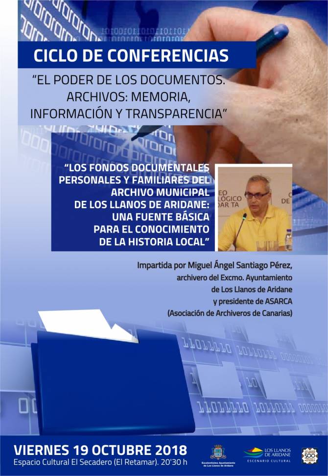 El archivero municipal de Los Llanos y presidente de la Asociación de Archiveros de Canarias (Asarca) Miguel Ángel Santiago Pérez, impartirá mañana viernes, 19 de octubre, una charla gratuita en la que este consagrado profesional de la archivística intercambiará impresiones con el público sobre la importancia de los documentos y archivos públicos y privados y su papel estratégico en torno a la preservación de la memoria histórica, el derecho a la información y la transparencia.