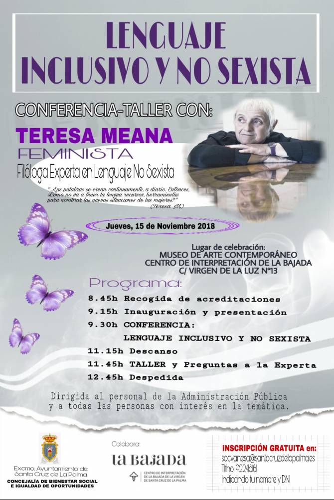 El Ayuntamiento de Santa Cruz de La Palma organiza una jornada dedicada al lenguaje inclusivo y no sexista que contará con la participación de la feminista y filóloga asturiana Teresa Meana, considerada una de las mejores especialistas en la materia.