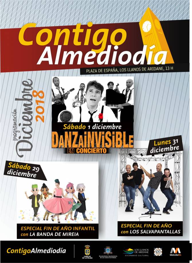 Contigo Almediodía cerrará 2018 a lo grande con tres conciertos en Los Llanos de Aridane. Diciembre se estrena el día 1 con el concierto de Danza Invisible y cerrará el 29 de diciembre con el concierto infantil a cargo de La Banda de Mireia y el 31 con el de Los Salvapantallas, completando con ello la programación de un año que deja tras de sí innumerables éxitos y muchas horas de ocio, música y entretenimiento.