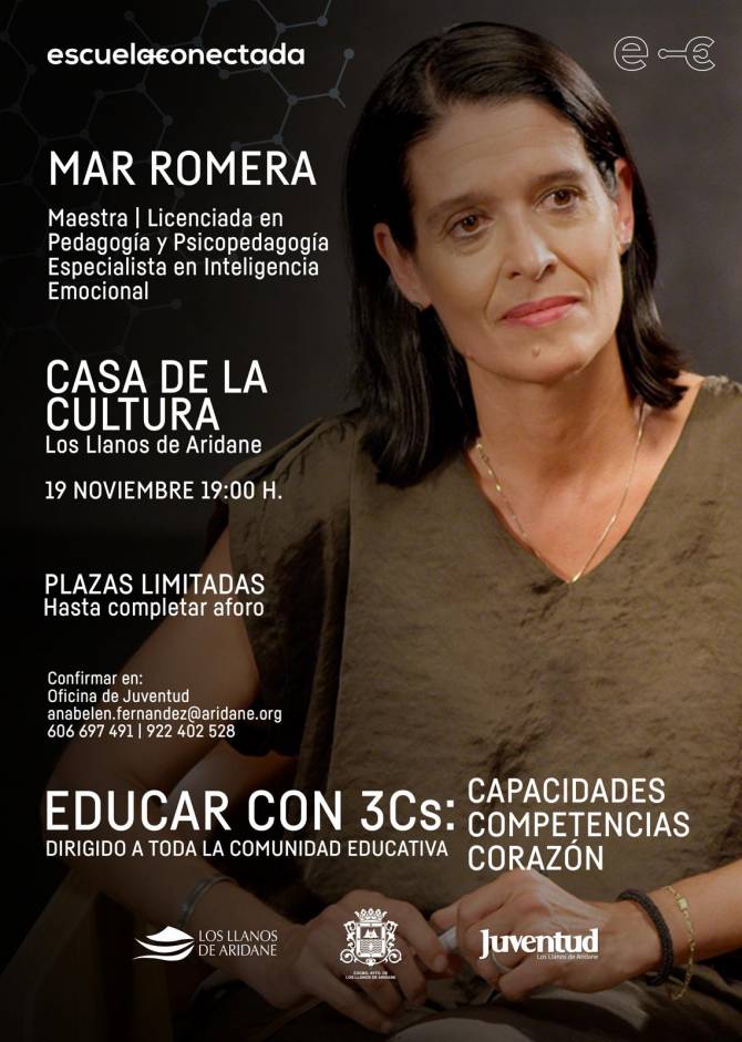 Mar Romera, la especialista en inteligencia emocional y educativa, visitará este lunes día 19 de noviembre Los Llanos de Aridane para impartir en la Casa de La Cultura, a partir de las 19:00 horas, una charla gratuita orientada a padres, profesorado y a la comunidad educativa en su conjunto en la que abordará la importancia de apostar por nuevos modelos educativos inspirados en las emociones, las habilidades, destrezas y capacidades como aspectos clave en el desarrollo personal e intelectual de los alumnos.