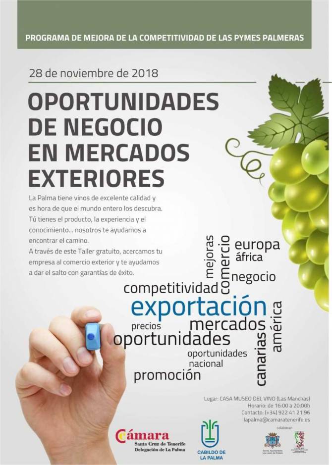 | La Delegación de la Cámara de Comercio en La Palma y el Cabildo Insular asesorarán a las pymes palmeras del subsector del vino sobre cómo abrir fronteras comerciales y acceder a nuevos mercados. Con este objetivo, mantendrán el próximo miércoles 28 de noviembre de 16:00 a 20:00 horas en la Casa Museo del Vino de Las Manchas, un encuentro de trabajo con las bodegas y los productores. El consejero de Agricultura, Ganadería y Pesca del Cabildo Insular de La Palma, José Basilio Pérez, resaltó que “La Palma cuenta con viticultores y producciones de excelente calidad, cuyo horizonte comercial está llamado a ir más allá de los límites del territorio insular” y apunta a la necesidad de mantener esta línea de trabajo y formación con el ámbito vitivinícola de la isla. “El Cabildo siempre ha mostrado su respaldo a los distintos sectores y subsectores que ponen en valor los productos de la tierra y una iniciativa de este calado nos sitúa también ante la necesidad de seguir fomentando el espíritu emprendedor en busca de propuestas empresariales con ganas de expandir sus negocios hacia el exterior para hacer más presente, si cabe, el nombre de los vinos de La Palma fuera de nuestra isla”. El consejero se mostró convencido de que “este encuentro, que es fruto de la alianza del Cabildo con la Cámara de Comercio, va a despertar el interés de los vitivinicultores de La Palma, ya que les ofrecerá apoyo y herramientas para animarles a ampliar sus oportunidades de negocio fuera de nuestro ámbito territorial en un mercado consumidor de vino que no conoce de fronteras, y que cada vez busca más la excelencia, valorando especialmente producciones artesanales y singulares como las que se dan en nuestra isla”. “Una carta de presentación privilegiada cuyas ventajas debemos aprovechar” añadió el consejero del Cabildo Insular de La Palma “para que los vinos palmeros se abran paso a nivel regional, nacional e internacional en un mercado exigente y competitivo, lo que nos exige conocer las herramientas que tenemos a nuestro alcance, profundizar en las claves y factores que intervienen en los procesos de comercialización diseñar estrategias adecuadas que debemos llevar a cabo en cada momento para no perder nuestras señas de identidad y, por tanto, la singularidad de nuestras producciones y, paralelamente asumir el reto inaplazable de posicionar el vino de La Palma con plenas garantías en el exterior, de ahí el interés de impulsar este encuentro con el subsector”. Por su parte, la coordinadora Insular de la Cámara de Comercio en La Palma, Raquel Díaz, afirmó que “los vinos de La Palma atesoran un prestigio y reconocimiento por su calidad” y que “su nombre está asociado a la excelencia y la autenticidad que han sabido imprimir los productores a unos vinos que, como los de nuestra Isla, marcan una clara diferencia en una oferta tan competitiva como la que existe hoy en día en este sector”. “Este hecho diferenciador” agregó “nos permite poner sobre la mesa vinos blancos y tintos, singulares y con mucha personalidad lo que, unido a la incorporación a las bodegas de jóvenes enólogos cualificados y con espíritu emprendedor nos animan a impulsar esta iniciativa que ofrece a los productores información especializada sobre la logística y operativa del mercado con el fin de que puedan diseñar la estrategia más adecuada en cada caso y dar el salto al exterior con garantías de éxito”. De hecho, uno de los principales objetivos del encuentro de trabajo, en el que estará presente la consultoría especializada en el desarrollo exterior de empresas Canarias Codexca, es el de explorar en profundidad las herramientas e itinerario a seguir a la hora de abordar los diferentes mercados y posicionar con garantías el producto en cada uno de ellos. Oportunidades de negocio Desde la Cámara de Comercio destacan que solo en Canarias, el vino palmero tiene un mercado regional con más de dos millones de consumidores potenciales que ofrecen la posibilidad de incrementar sus ventas. En este sentido cabe resaltar la importancia de abrir el mercado y mejorar la competitividad mediante las oportunidades que ofrece la regionalización y la internacionalización de la actividad empresarial. Una realidad cada vez más fundamental para en un mundo más globalizado. Y es que, a nadie se le escapa que este salto de las empresas más allá de la Isla, primero en Canarias, para luego avanzar en el comercio nacional e internacional, es complejo y requiere de un asesoramiento profesional para realizar con éxito esta incursión. Por tanto, la experiencia desarrollada por la Cámara de Comercio en este sentido avala a esta entidad como la institución idónea para desplegar esta tarea de apoyo a las pymes palmeras en sus procesos de regionalización e internacionalización. Durante el encuentro con el sector, los asistentes analizarán las oportunidades de negocio que tiene un producto de calidad como los vinos palmeros, a través de un análisis de una serie de factores, como la situación actual del sector en el exterior; las debilidades y fortalezas que presenta en los mercados más allá de la Isla; la estructura y composición de la oferta actual en los mercados exteriores, y las principales empresas españolas y canarias que operan en el exterior. Otro de los bloques temáticos que se abordarán durante la reunión será la operativa del comercio exterior en el sector, tratando cuestiones de gran interés y de manera práctica como la adaptación del producto a la normativa legal o al mercado del país, así como las partes que intervienen en las operaciones internacionales (empresas de transportes; bancos y compañías de seguros; aduana, y agentes y representantes). Un encuentro en el que, además, se abordarán otras claves en materia de comercio exterior como la fijación de los precios en la exportación (precio de coste, precio neto, costes de transporte, cot