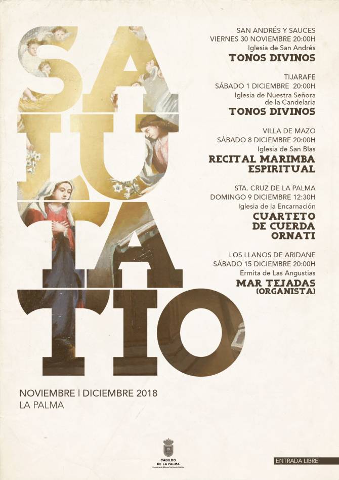 La programación del ciclo comienza este viernes, 30 de noviembre, en la iglesia de San Andrés, en San Andrés y Sauces, con el programa Tonos divinos. Ese mismo programa se volverá a interpretar el sábado 1 de diciembre en la iglesia de Nuestra Señora de la Candelaria de Tijarafe. El sábado 8 de diciembre la iglesia de San Blas, en Villa de Mazo, acogerá el recital Marimba espiritual; al día siguiente, en la iglesia de la Encarnación, en la capital de la isla, actuará el cuarteto de cuerda Ornati. El ciclo Salutatio se cierra con el concierto de la organista Mar Tejadas el sábado 15 de diciembre, en la ermita de Nuestra Señora de Las Angustias, en Los Llanos de Aridane.