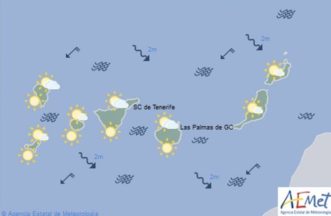 Viento del nordeste flojo a moderado, con brisas en costa oeste. En medianías predominará la componente este.