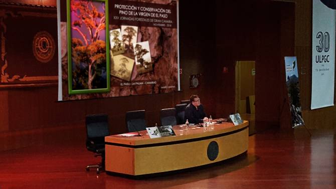 "Protección y conservación del Pino de La Virgen de El Paso" fue el título de la ponencia de Andrés Carmona, Concejal de Cultura y Patrimonio del Ayuntamiento pasense, dentro de las XXV Jornadas Forestales de Gran Canaria, en el Paraninfo de la Universidad Las Palmas de Gran Canaria, a la que acudieron un importante número personas y en la que el edil realizó un repaso histórico y otros importantes aspectos del El Pino de la Virgen.