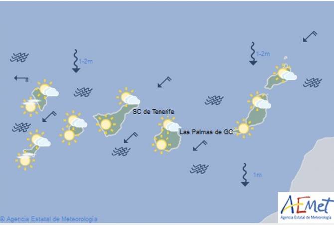 Viento de componente este flojo a moderado, con predomino de brisas en la vertiente oeste de la isla.