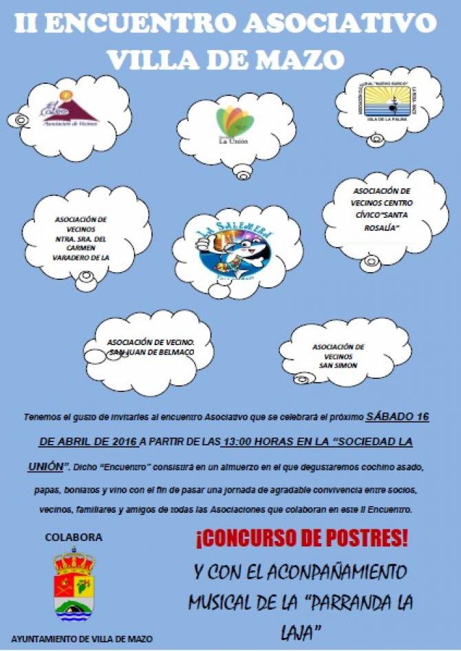 El Presidente de la Sociedad la Unión invita a todos aquellos que forman parte de Asociaciones o Movimientos Vecinales a acercarse el próximo sábado a su sede social, en el mismo corazón de Mazo, y compartir un almuerzo y una tarde diferente. “Se trata de un encuentro para pasar una jornada de agradable convivencia entre vecinos, familiares y amigos de todas las asociaciones que colaboran en este II Encuentro que esperamos que se siga consolidando en el tiempo”.