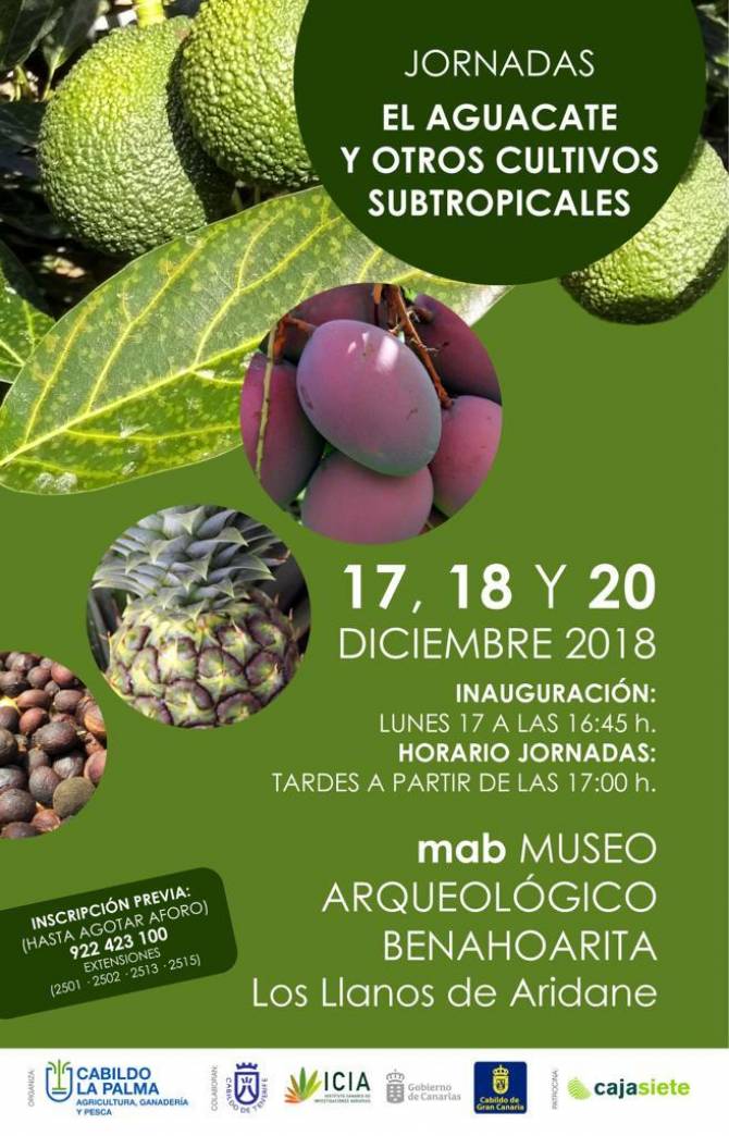 El Cabildo Insular de La Palma, a través de la Consejería de Agricultura, Ganadería y Pesca, celebrará unas jornadas dedicadas al cultivo del aguacate y otros cultivos subtropicales. El encuentro contará con las charlas y ponencias de técnicos de prestigio de Canarias. La cita, que está dirigida fundamentalmente a agricultores de la isla, se desarrollará los días 17, 18 y 20 de diciembre, en horario de tarde, en el Museo Arqueológico Benahoarita, en Los Llanos de Aridane.