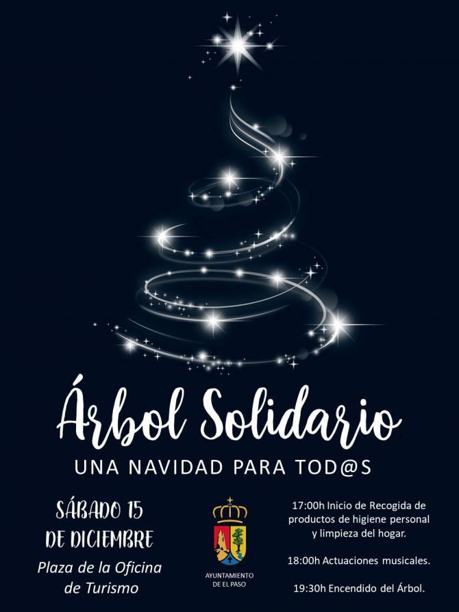 Este sábado día 15 desde las 17.00h, el espíritu de la Navidad se elevará al cielo por tercer año consecutivo con la colocación y encendido del árbol solidario que se ubicará, en la plaza de la oficina de turismo del municipio de El Paso. El motivo del mismo es el de colaborar con las familias que más lo necesitan aportando productos de higiene y limpieza por parte de los diferentes colectivos y de la ciudadanía en general.