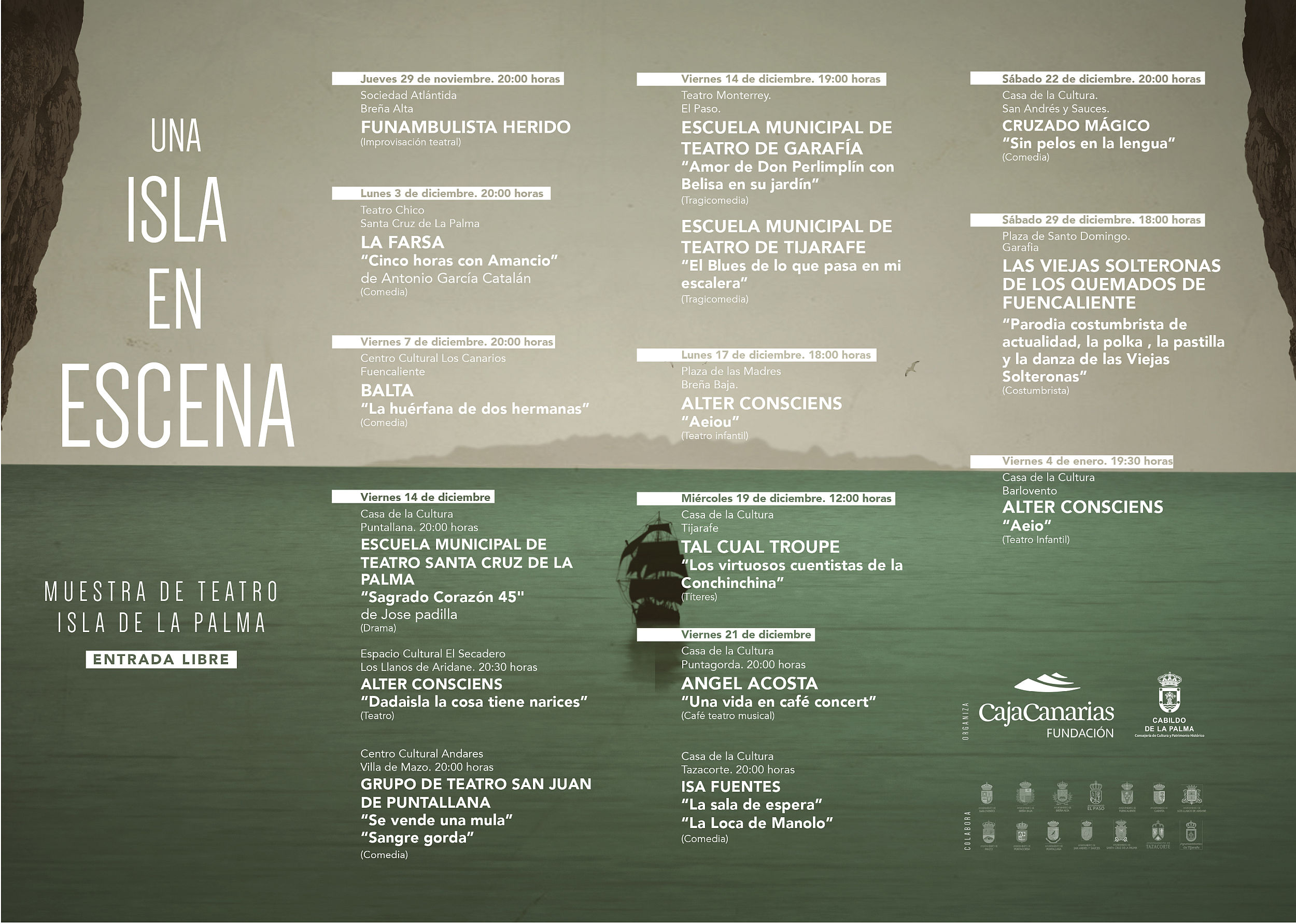 El ciclo de teatro gratuito en La Palma Una isla en escena, que organiza la Consejería Insular de Cultura y Patrimonio Histórico del Cabildo junto con la Fundación CajaCanarias, presenta este fin de semana la representación de un total de tres actuaciones en los municipios de Puntagorda, Villa y Puerto de Tazacorte y San Andrés y Sauces.