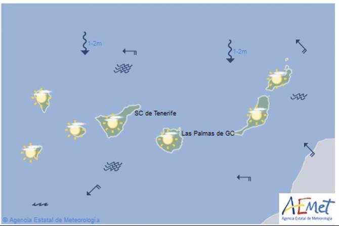 Viento del este flojo a moderado, más intenso en puntas norte y sur, girando a sureste flojo a moderado por la tarde, con intervalos de fuerte en cumbres al final.