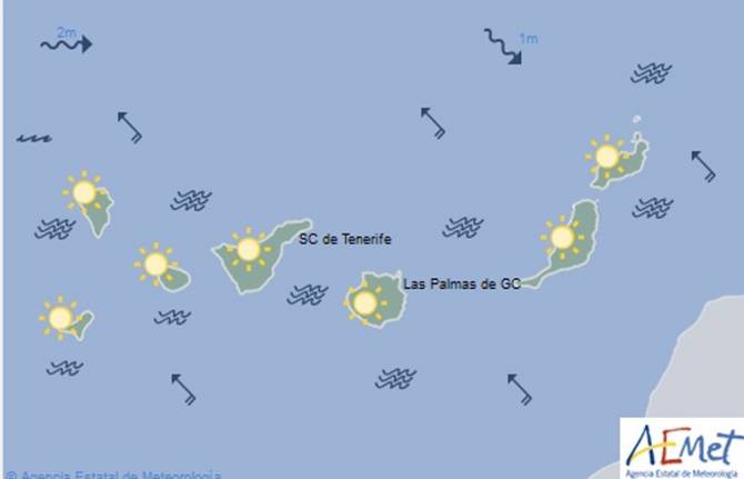 Viento del sudeste moderado, tendiendo a flojo por la tarde. Del sur moderado en medianías y zonas altas.