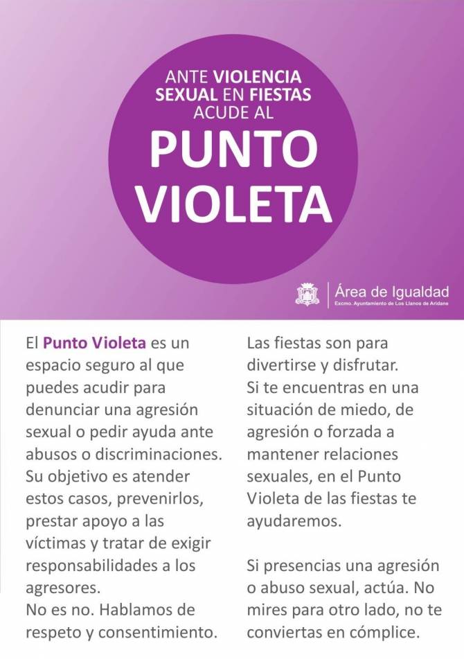 El Ayuntamiento de Los Llanos de Aridane se ha sumado a la campaña Punto Violeta. Una iniciativa que sembrará el municipio de un icono que como el éste, reivindica la necesidad de dar un paso adelante y adoptar una actitud proactiva frente a los diferentes tipos de violencia que se ejercen contra las mujeres en los espacios festivos, realizar una denuncia firme y conjunta, y trabajar para su prevención y erradicación.