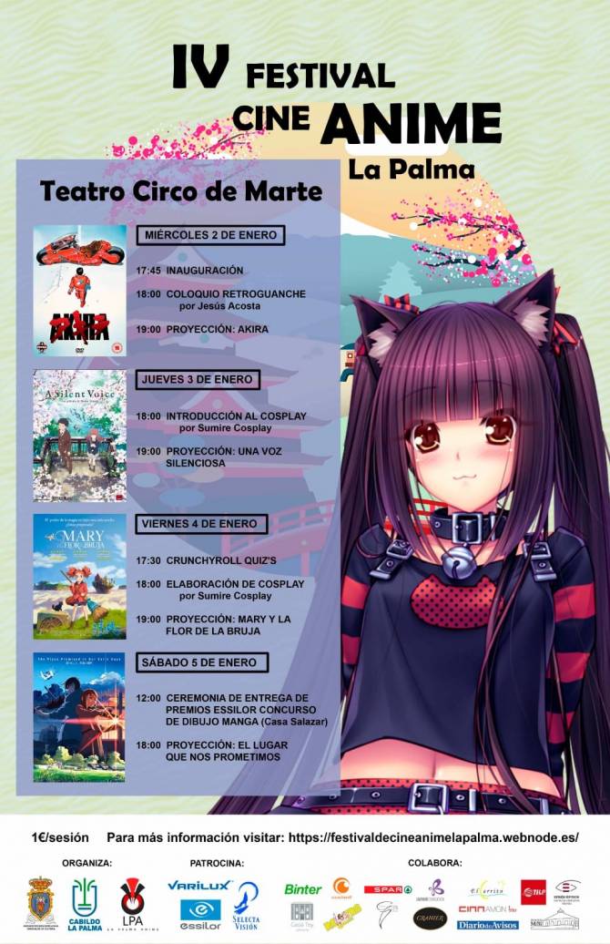 El Festival, organizado por la Asociación La Palma Anime, el Ayuntamiento de Santa Cruz de La Palma y el Cabildo Insular, se desarrolla entre el miércoles, 2 de enero, y el sábado 5. Podrán verse cuatro películas de referencia en el mundo de la animación japonesa, combinándose los títulos clásicos junto a otros de reciente estreno.