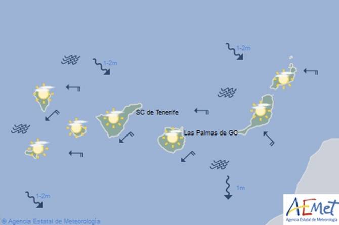 Viento del este a sureste flojo a moderado, más intenso por la tarde en extremos sur y nordeste y zonas altas. Brisas en costas oeste.