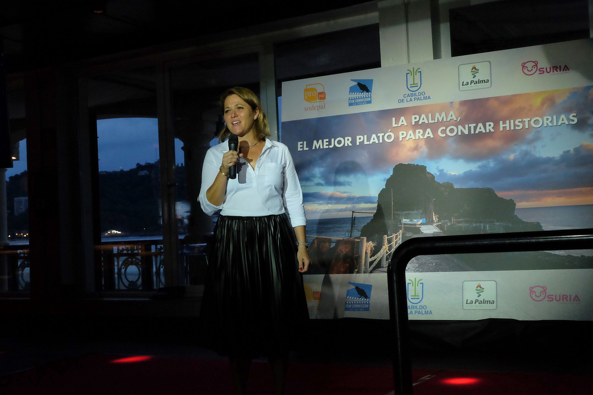 La consejera de Turismo del Cabildo de La Palma, Alicia Vanoostende, encabezó la delegación palmera en la capital guipuzcoana, donde la sala Bataplán –situada en la playa de la Concha- albergó un evento de promoción y presentación que reunió a un centenar de personas, entre las que se encontraban los más destacados productores del cine español, la prensa especializada, así como profesionales y empresas del sector audiovisual de la Isla.