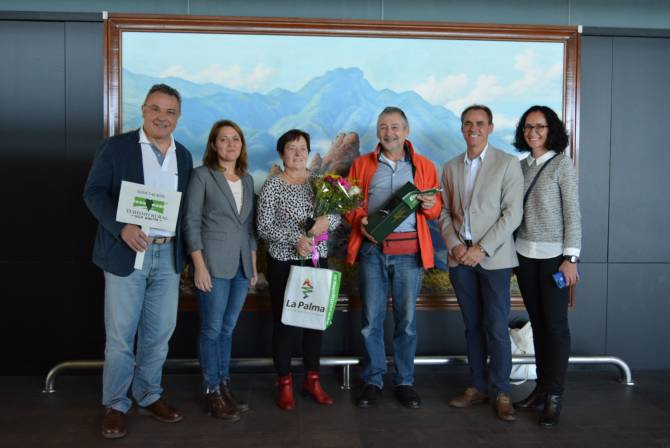 El presidente de la asociación, Carlos Fernández, y la consejera de Turismo del Cabildo de La Palma, Alicia Vanoostende, han dado la bienvenida hoy en el aeropuerto a esta pareja de visitantes, a quienes han agasajado a su llegada y que, gracias a su reserva 50.000, disfrutarán de regalos especiales para disfrutar aún más de su estancia en la isla.