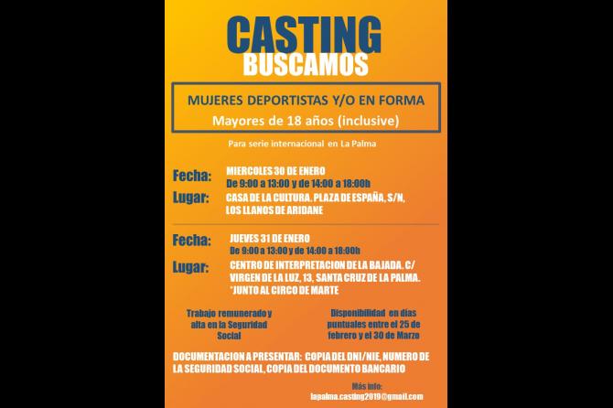 Los casting se desarrollarán el miércoles 30 de enero: Casting para Mujeres deportistas y/o en forma. El lugar será la Casa de la Cultura de Los Llanos de Aridane, en horario de 9:00 a 19:00 horas.