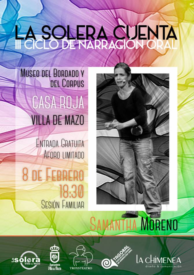 Samantha Moreno, original de Tenerife, participó en 1995 en un espectáculo de narración oral para el público adulto llamado Vivir del cuento a cargo de la compañía universitaria Troysteatro y, a partir de ahí, ha continuado realizando estas actividades.