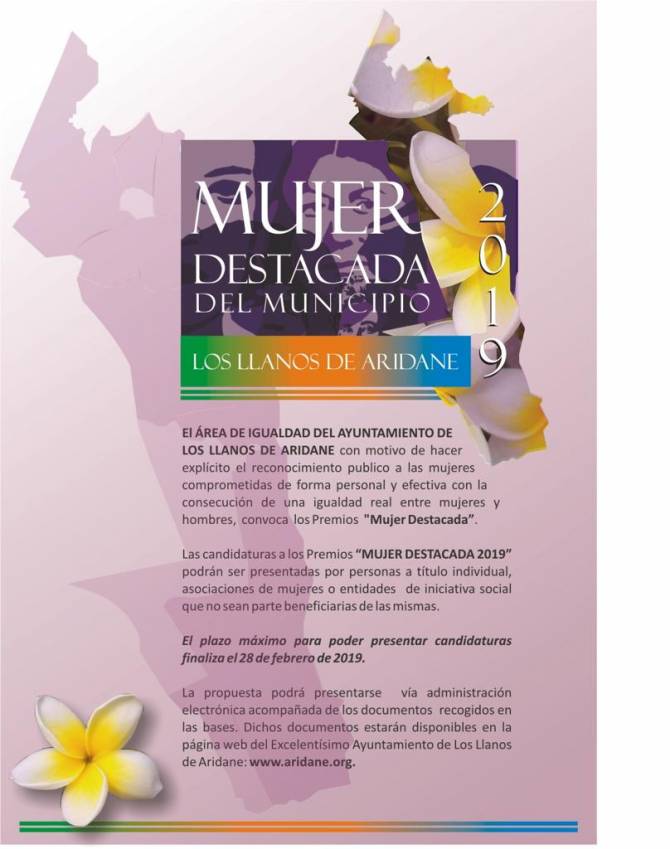 De esta manera, y hasta el próximo día 28 de febrero, los aridanenses podrán realizar sus propuestas a través de la sede electrónica de la corporación municipal www.aridane.org, nominando a aquellas mujeres que consideren que deben ser reconocidas por su pueblo.