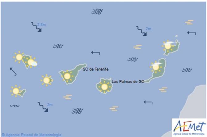 Viento del este-sureste flojo en general, con predominio de las brisas en costas. En medianías y zonas altas, viento del sur moderado a fuerte, disminuyendo a flojo a moderado al final de la tarde.