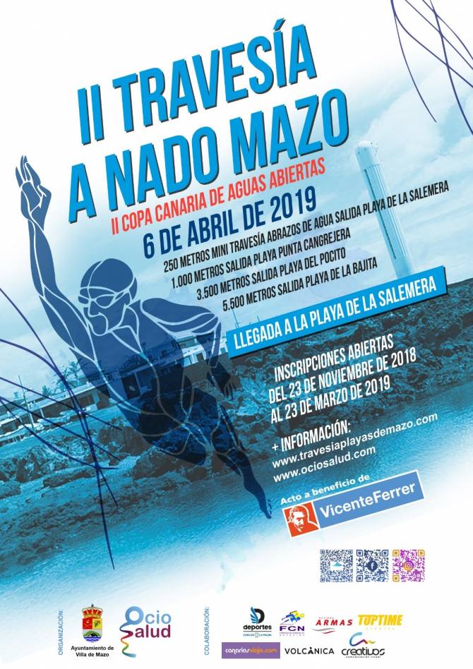 La II Travesía a Nado Playas de Mazo, que se celebra el 6 de abril, abrirá el calendario de la Copa Canaria de Aguas Abiertas 2019, organizada por la Federación Canaria de Natación. La prueba, organizada por el Ayuntamiento de Villa de Mazo y la empresa de organización de eventos deportivos, culturales y sociales Ocio Salud, mantiene abierto el plazo de inscripción hasta el día 23 de marzo.