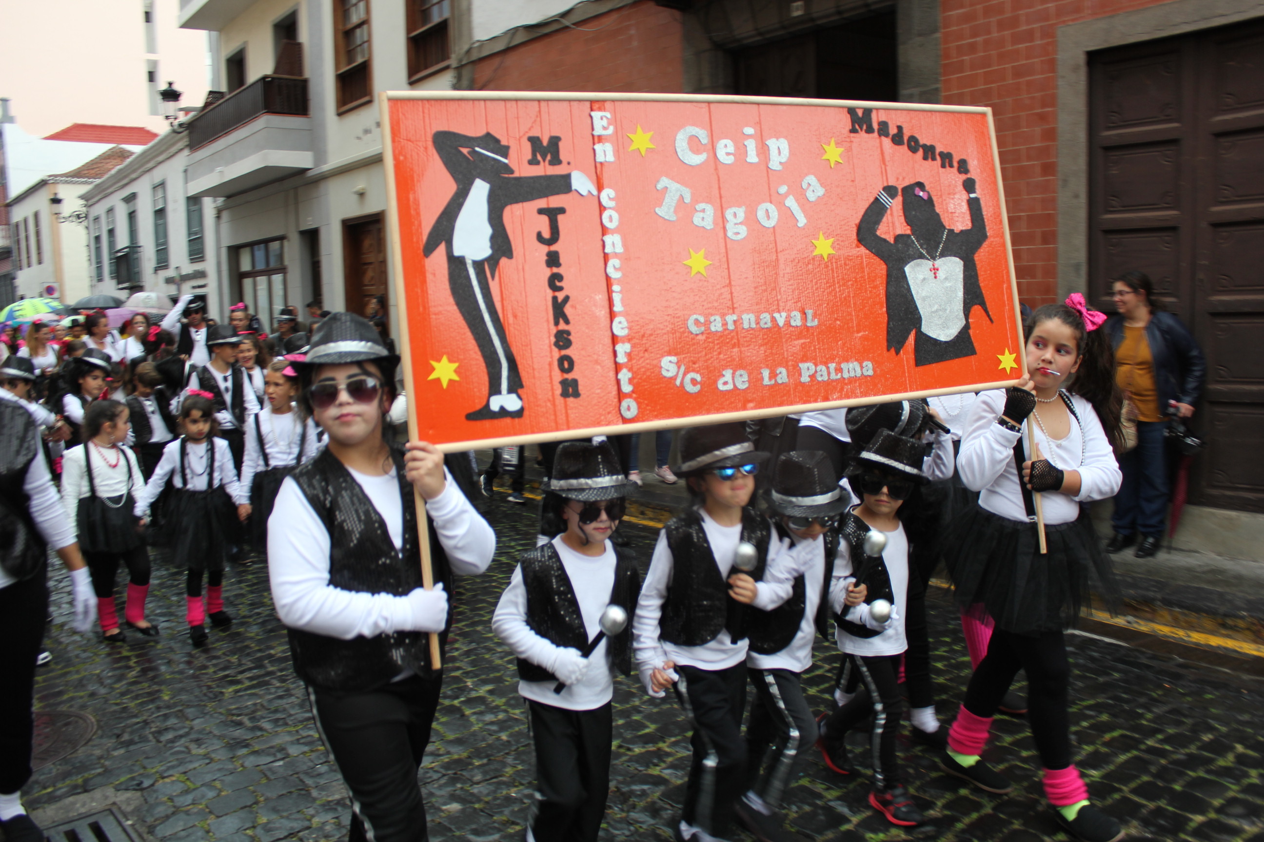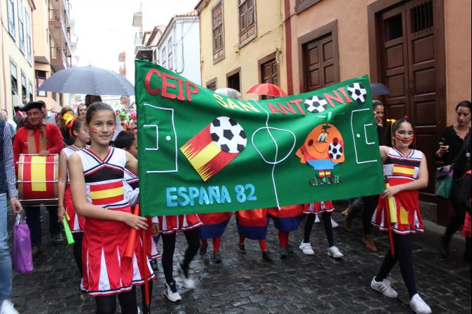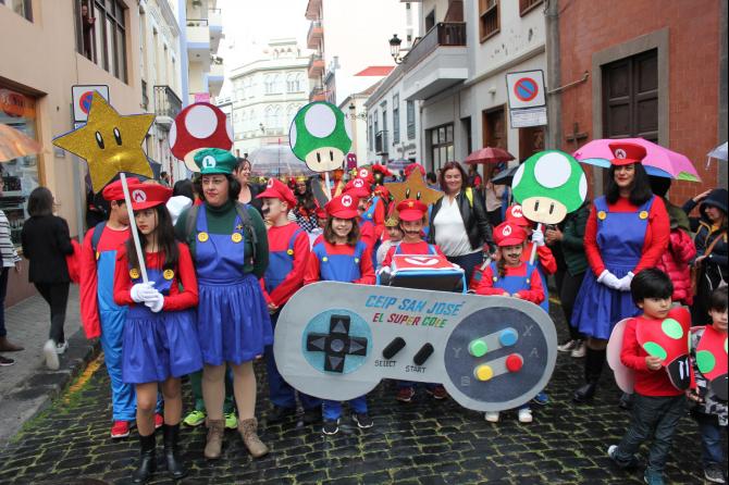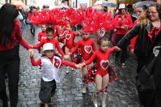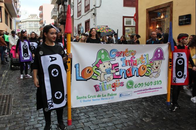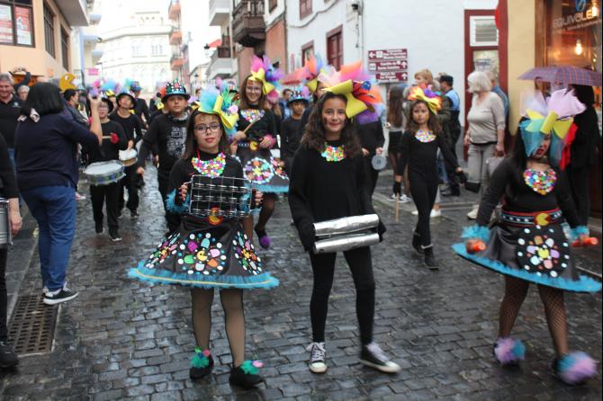 Pese a la lluvia, cientos de niños y mayores de los centros escolares de Santa Cruz de La Palma participaron en el desfile anunciador del Carnaval de Santa Cruz de La Palma