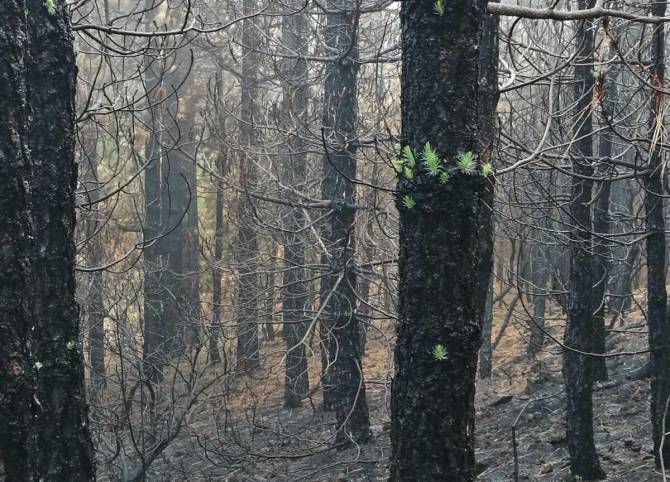 El pino canario ya está cambiando lo negro que dejó el fuego por lo verde de sus brotes.