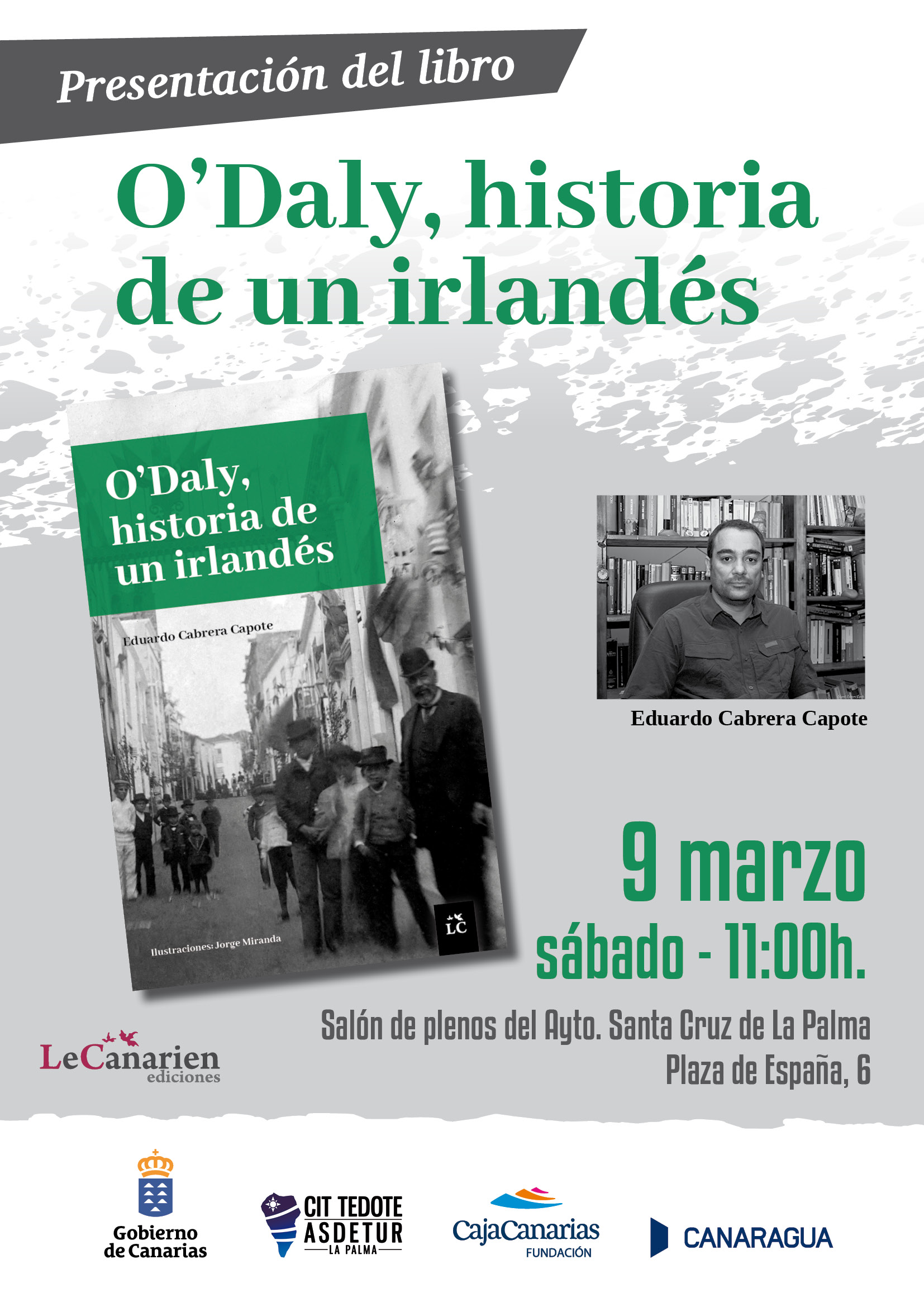 El Ayuntamiento de Santa Cruz de La Palma acoge este sábado, 9 de marzo, la presentación del libro O’Daly, historia de un irlandés, del periodista y escritor Eduardo Cabrera Capote, un relato novelado sobre uno de los personajes más relevantes y decisivos de la historiografía palmera que publica la editorial Le Canarien.