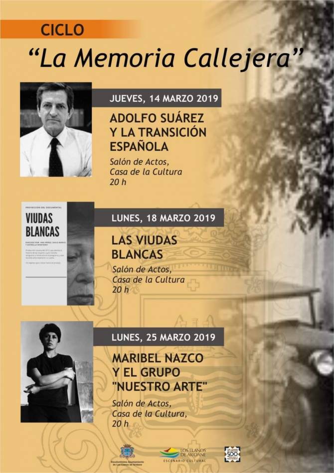El ciclo de conferencias, que se celebrará en la Casa de La Cultura de Los Llanos de Aridane a las 20:00 horas, arranca el jueves 14 de marzo con la charla “Adolfo Suárez y la transición española”. Asimismo, el lunes 18 de marzo tendrá lugar la proyección del documental Viudas Blancas, con su posterior debate. Finalmente, el lunes 25 de marzo se celebrará la de “Maribel Nazco y el grupo Nuestro Arte”.