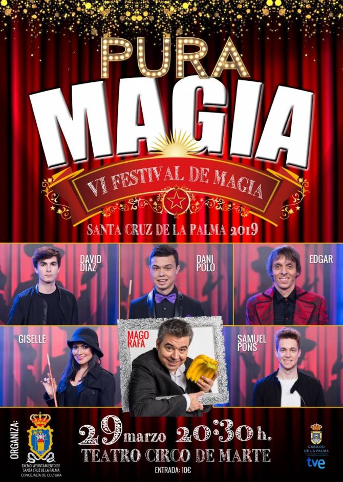 Presentada por el Mago Rafa, un asiduo en los mejores Festivales de Magia del país y conocido del público palmero, la gala Pura Magia contará con los magos Dani Polo, considerado como uno de los magos con más proyección del panorama nacional; Gisell, galardonada con el primer premio nacional de España, entre otros reconocimientos; Mag Edgard, especializado en magia para todo tipo de público; Samuel Pons, que con tan solo 20 años es uno de los magos de moda en nuestro país; y David Díaz, un joven mago que está triunfando en los campeonatos nacionales e internacionales de magia.