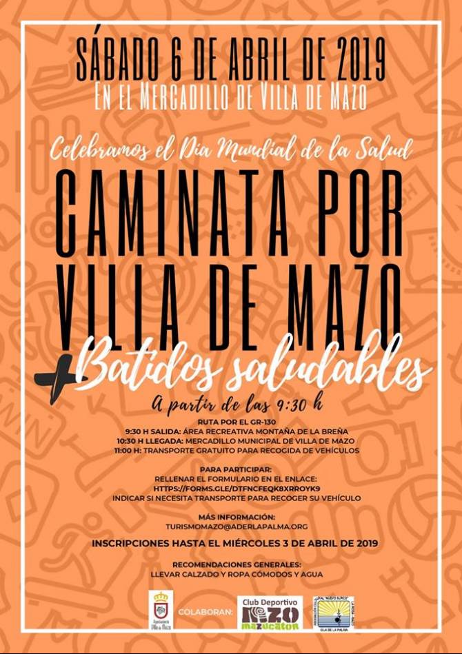 El Ayuntamiento de Villa de Mazo organiza el próximo sábado 6 de abril, con motivo del Día Mundial de la Salud, una caminata por el por el municipio, una actividad abierta a cuantas personas quieran participar.