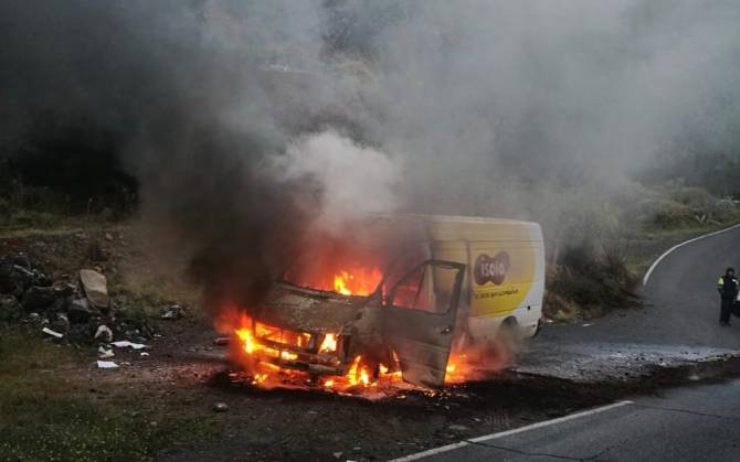 Un furgon de reparto ha resultado envuelto en llamas a las 07:45 horas este miércoles en la zona de Barranco Jurado en Tijarafe. No se ha informado de la existencia de víctimas graves ni más daños en la zona.