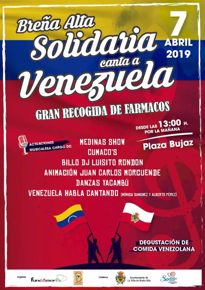 Este domingo día 7 a partir de las 13:00 hotas, Breña Alta solidaria le cantará a Venezuela, en medio de una jornada en que se recogerán fármacos para ayudar al país hermano.