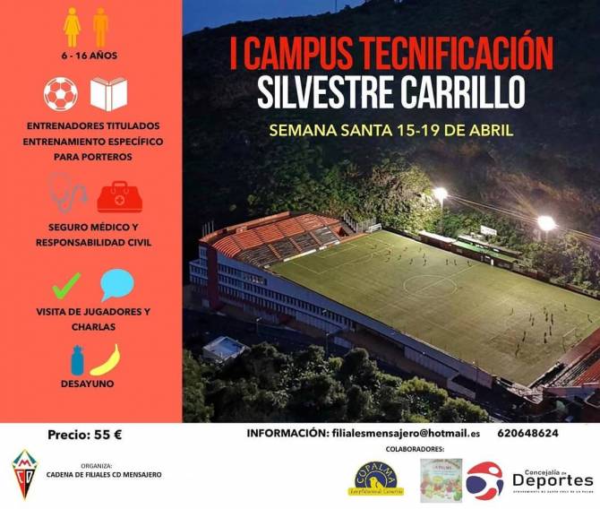 El Ayuntamiento de Santa Cruz de La Palma colabora con el primer Campus de Tecnificación del Silvestre Carrillo. Se trata de una actividad organizada por la cadena de filiales del CD Mensajero y que tendrá lugar del 15 al 19 de abril, durante la Semana Santa. El horario será de 09:00 a 13:30.