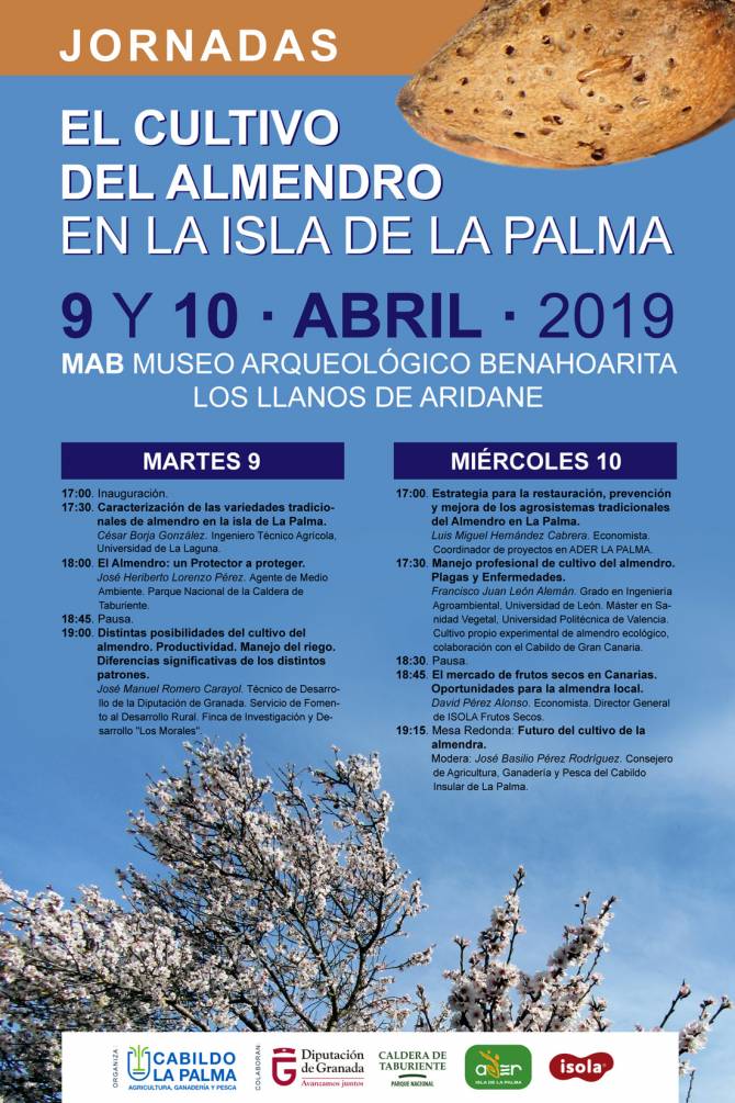 En la primera sesión de las jornadas se impartirán charlas por parte de César Borja González, ingeniero técnico agrícola de la Universidad de La Laguna (La Palma); José Heriberto Lorenzo Pérez, agente de Medio Ambiente del Parque Nacional de la Caldera de Taburiente (La Palma); y José Manuel Romero Carayol, técnico de desarrollo de la Diputación provincial de Granada en la finca de investigación y desarrollo Los Morales (Granada). El miércoles 10 será el turno de Luis Miguel Hernández Cabrera, economista y coordinador de la Asociación para el Desarrollo Rural de la isla (La Palma), Francisco Juan León Alemán, grado en ingeniería agroambiental por la Universidad de León y máster en sanidad vegetal por la Universidad Politécnica de Valencia (Gran Canaria); y David Pérez Alonso, economista y director general de Isola Frutos Secos (Tenerife), concluyendo con una mesa redonda sobre el futuro del cultivo de la almendra.