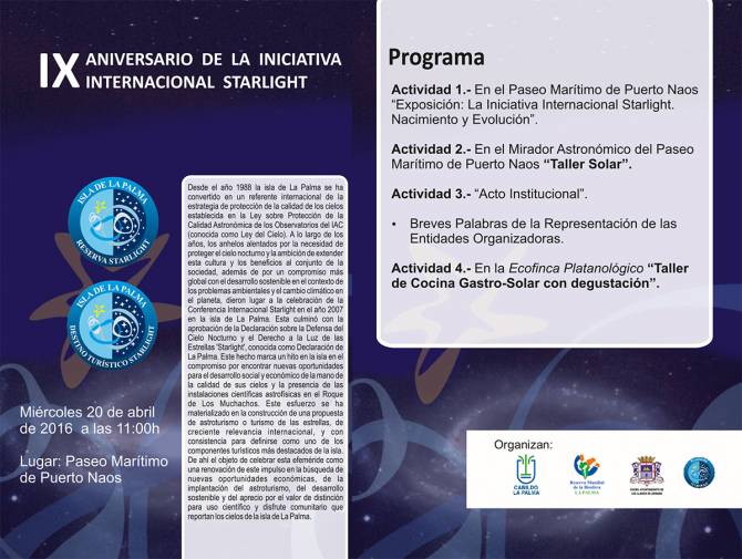 El acto estará coorganizado por el Cabildo de La Palma, la Reserva Mundial de la Biosfera de La Palma, el Ayuntamiento de Los Llanos de Aridane y la Fundación Starlight y se celebrará a partir de las 11:00 horas en el Paseo Marítimo de Puerto Naos, donde se inaugurará la exposición La iniciativa internacional Starlight. Nacimiento y evolución, se celebrará un taller solar en el mirador astronómico ubicado en este paseo, se realizará el acto institucional con la intervención de los representantes de las entidades organizadoras y se concluirá con un taller de cocina gastro-solar con degustación en la Ecofinca Platanológico.