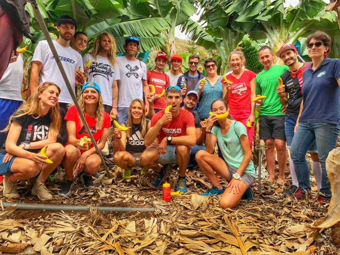 Este viernes, algunos de los corredores más destacados que participarán en la Transvulcania 2019 han visitado una finca de plataneras en La Palma, con el objetivo de conocer de primera mano el cultivo del plátano y los motivos que hacen del Plátano de Canarias un producto único en su categoría.