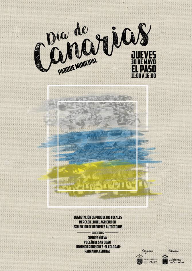 Este jueves día 30, jornada en la que celebramos el día de canarias el Ayuntamiento de El Paso ha preparado un programa de actividades “lúdico festivas” en la que desde las 11:00 horas podrás disfrutar de diferentes exhibiciones de deportes tradicionales tales como la Lucha Canaria con la Escuela Tajogaite o del Salto del Pastor con Jurria Tenerra, así como, del Juego del Palo con el Club Aragavia. También habrá degustaciones de productos locales y mercadillo del agricultor. A partir de las 12:00 horas actuaciones musicales con la Asociación Folclórica Cumbre Nueva, la Asociación Folclórica Volcán de San Juan y la Parranda Central.