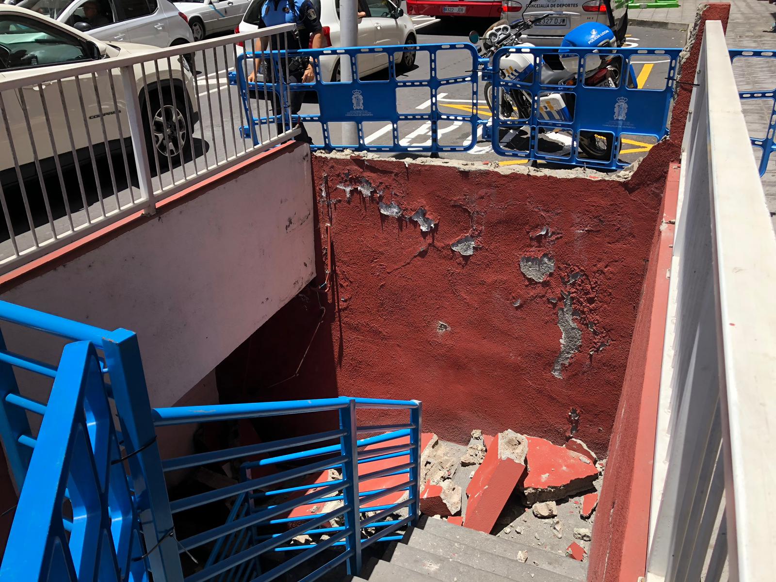 Una guagua choca contra la pared de una de las entradas del Parking de El Puente, provocando el desprendimiento del muro hacia el interior de la entrada.