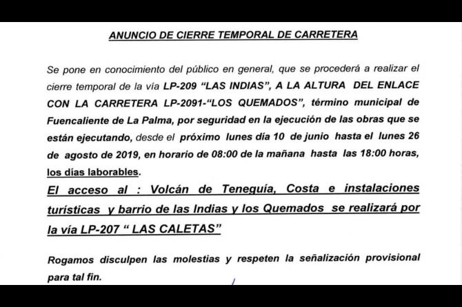 El referido corte de la vía será efectivo exclusivamente los días laborables en horario de 8:00 a 18:00 horas. Durante el mismo, el acceso al Faro de Fuencaliente, a la zona costera de esta localidad y a los barrios de Las Indias y Los Quemados deberá realizarse por la carretera de Las Caletas (LP-207).