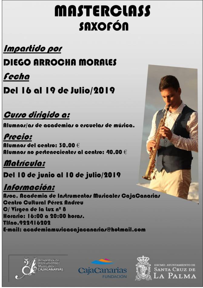 La Asociación Academia de Instrumentos Musicales CajaCanarias ofrece una Masterclass de saxofón a nivel insular impartida por Diego Arrocha Morales, dirigida a alumnos y alumnos y alumnas de academias o escuelas de música.