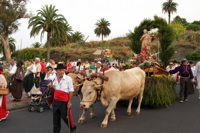 A las 16:45 está prevista la bendición de los romeros para seguidamente comenzar con la bajada de romeros y carrozas acompañadas de la Asociación Cultural Coros y Danzas de Ingenio, Breñas Marjué, Agrupación de Castañuelas de Breña Alta y Agrupación Aduares entre otros.