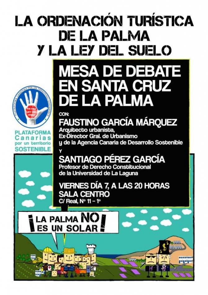 La plataforma 'La Palma, territorio sostenible', integrada por sindicatos, partidos políticos, organizaciones ecologistas, sociales y culturales, y profesionales de diversos sectores organiza una Mesa de Debate sobre la ordenación turística de La Palma y la Ley del Suelo.