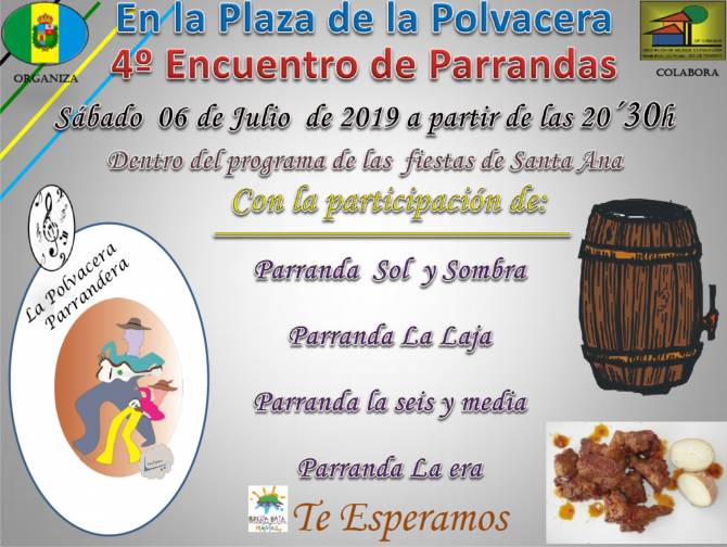 El sábado 6 de julio, 20.30 h, la asociación de vecinos de La Polvacera celebra el cuarto “Encuentro de Parrandas”, en el marco de las Fiestas Copatronales de Santiago Apóstol y Santa Ana, conjuntamente con el Ayuntamiento de Breña Baja.