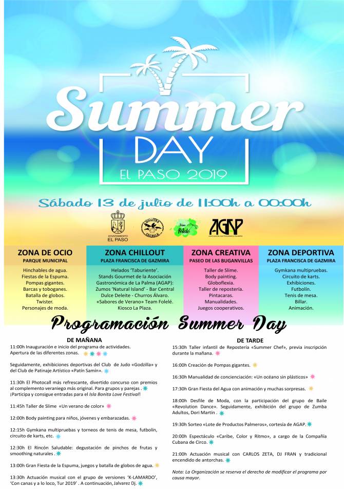 El Paso celebra el verano por todo lo alto con una nueva edición del "Summer Day" este sábado 13 de julio en la plaza Francisca de Gazmira desde las 11:00 de la mañana, más de doce horas ininterrumpidas de diversión en familia: hinchables de agua, fiesta de la espuma, música en vivo, exhibiciones deportivas, talleres creativos, malabares, espectáculos, zona chillout, helados artesanales, degustaciones veraniegas, photocall con premios y sorteos de entradas para el Isla Bonita Love Festival y muchas sorpresas.